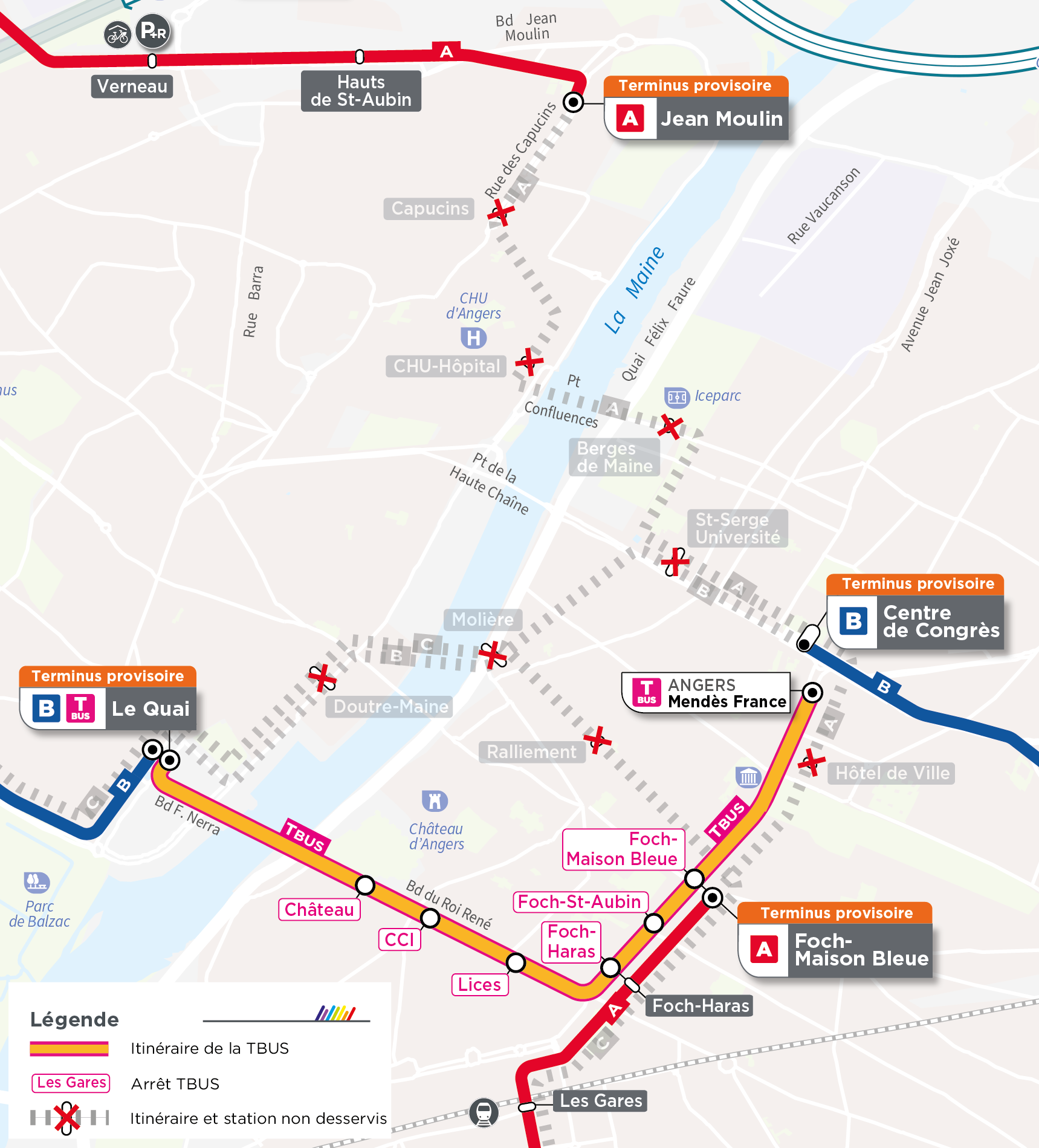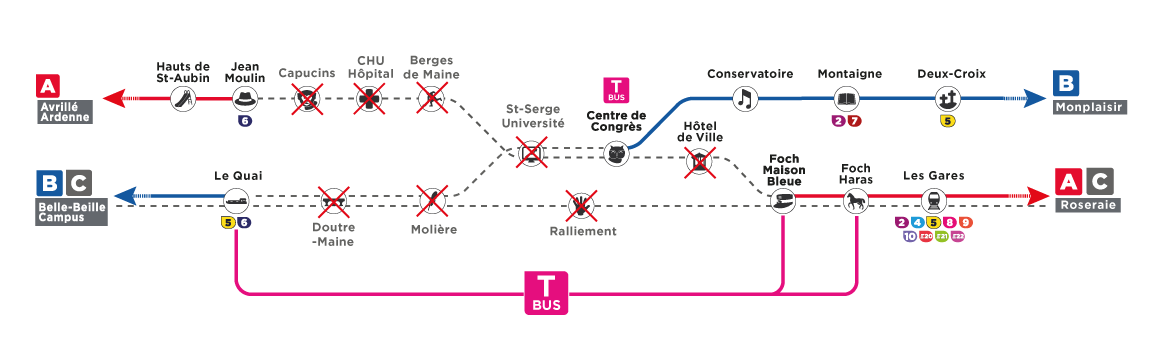 - ❌ Stations non desservies par la ligne A : Capucins, CHU-Hôpital, Berges de Maine, St-Serge Université, Centre de Congrès, Hôtel de Ville